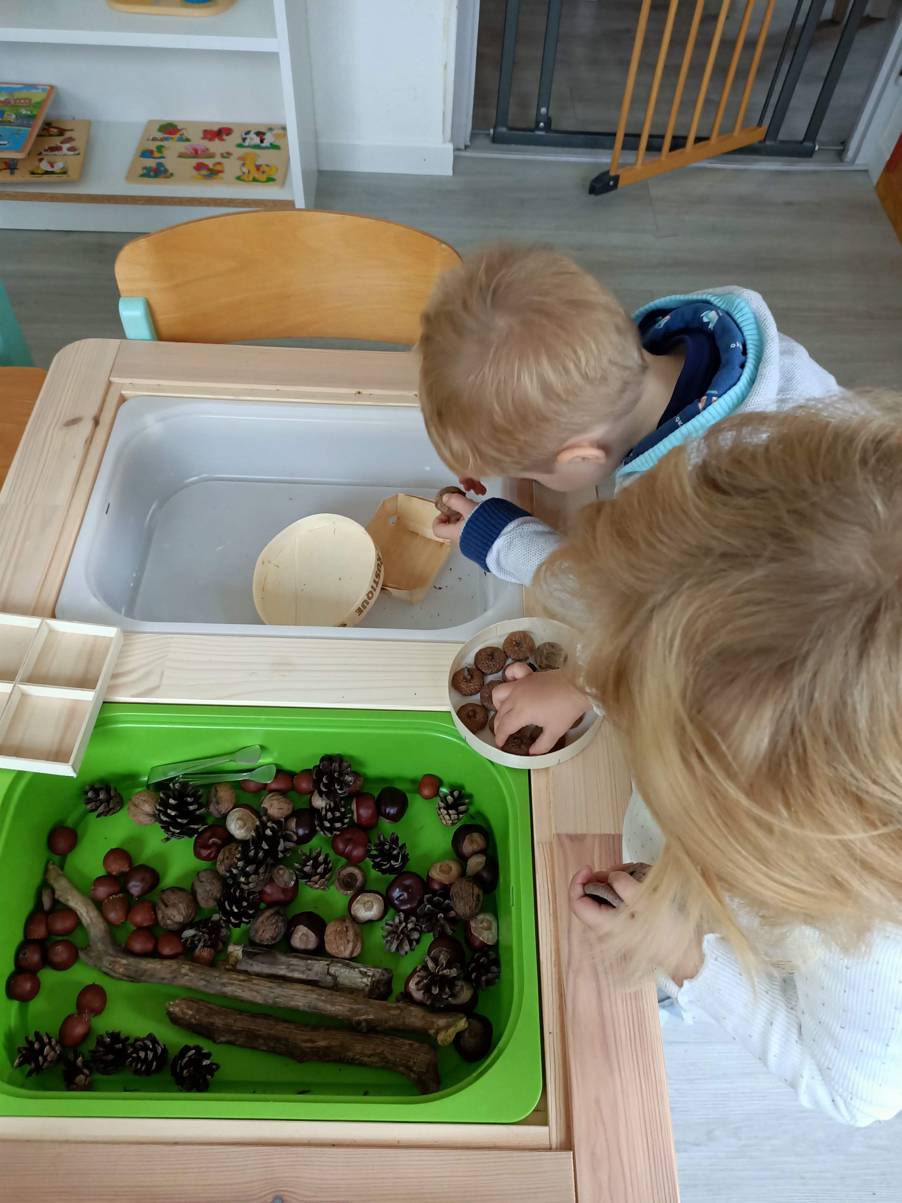 Clément et Malaury s'amusent à trier le bac de manipulation d'automne. Ils retrouvent les trésors récoltés dans la forêt.